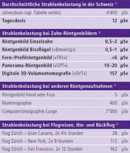 Gegenüber der klassischen Analog-Röntgentechnik hat das digitale Röntgen mehrere Vorteile. Die Strahlenbelastung ist um bis zu 90 Prozent reduziert und statt des konventionellen Röntgenfilms können die Röntgenbilder am Computer in einer enorm hohen Detailvielfalt betrachtet werden. Die natürliche und zivilisatorische Strahlung führt in der Schweiz zu einer jährlichen durchschnittlichen Exposition von 4400 Mikrosievert pro Kopf (Tagesdosis 12 Mikrosievert). Je nach Aufenthaltsort (Flachland oder Bergregion, Beschaffenheit des Untergrundes) ist der tatsächliche Wert tiefer oder höher. Den grössten Anteil haben Zerfallsprodukte von Radon, die in schlecht belüfteten Innenräumen entstehen (3200 pro Jahr) oder die Strahlung aus dem Weltraum (400 Mikrosievert) welcher wir bei Bergwanderungen oder im Flugzeug ausgesetzt sind. Die Strahlenbelastung einer einzelnen analogen Zahnfilmröntgenaufnahme beträgt etwa 2,1 bis 5,5 Mikrosievert, bei digitaler Aufnahmetechnik beträgt die Strahlenbelastung nur noch etwa 0.5 Mikrosievert und entspricht 1/24 der Tagesdosis.